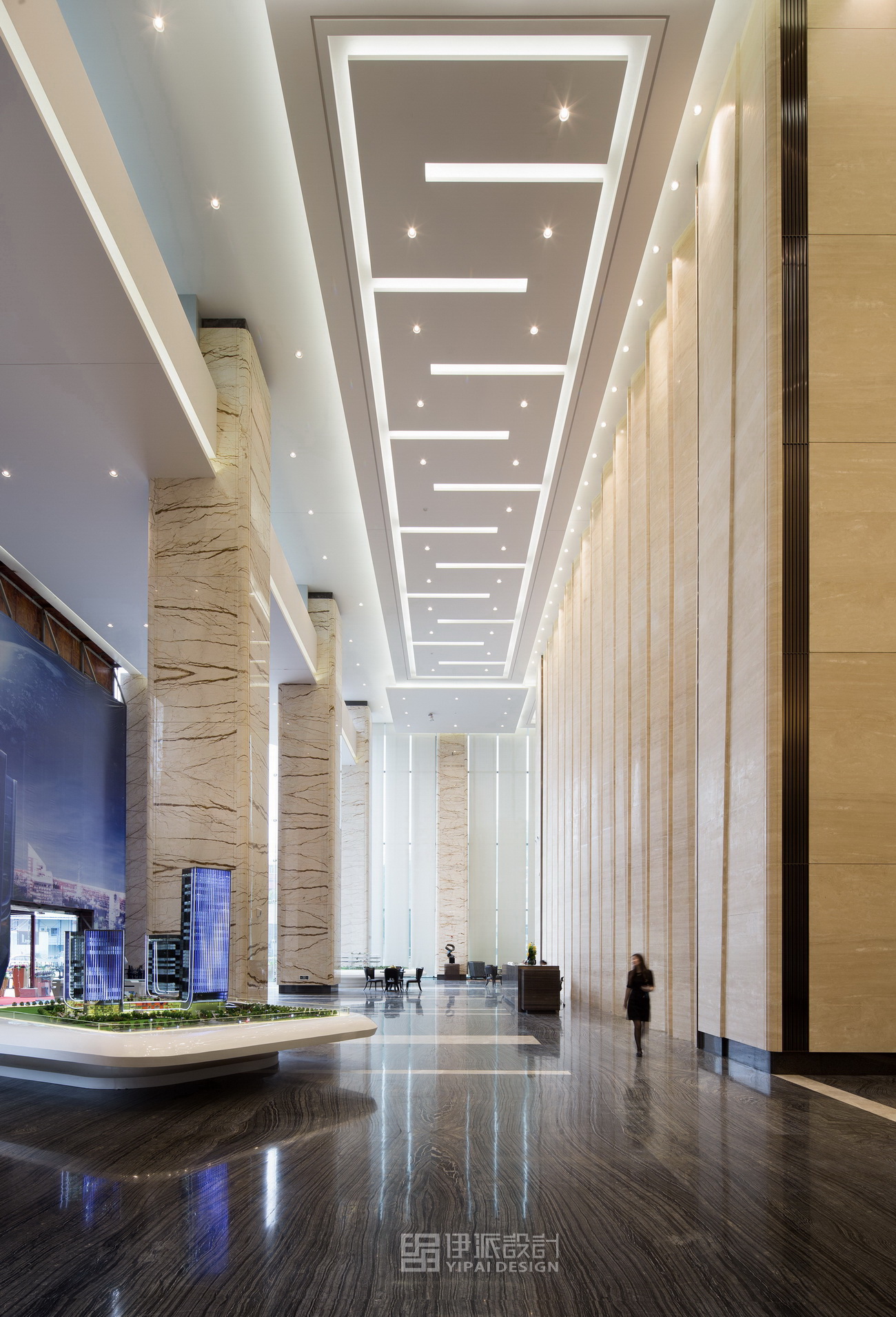 南山華僑城片區(qū)的方大城樓盤,規(guī)劃面積44000平方米,售樓處面積2500平方米,定位于標(biāo)準(zhǔn)寫字樓,因此,售樓處設(shè)計(jì)手法皆是以呈現(xiàn)現(xiàn)代高效辦公大樓視覺效果為主。在層高優(yōu)勢(shì)的基礎(chǔ)上,通過空間韻律與層次,賦予空間更為現(xiàn)代化、高效化的視覺、辦公體驗(yàn)感。