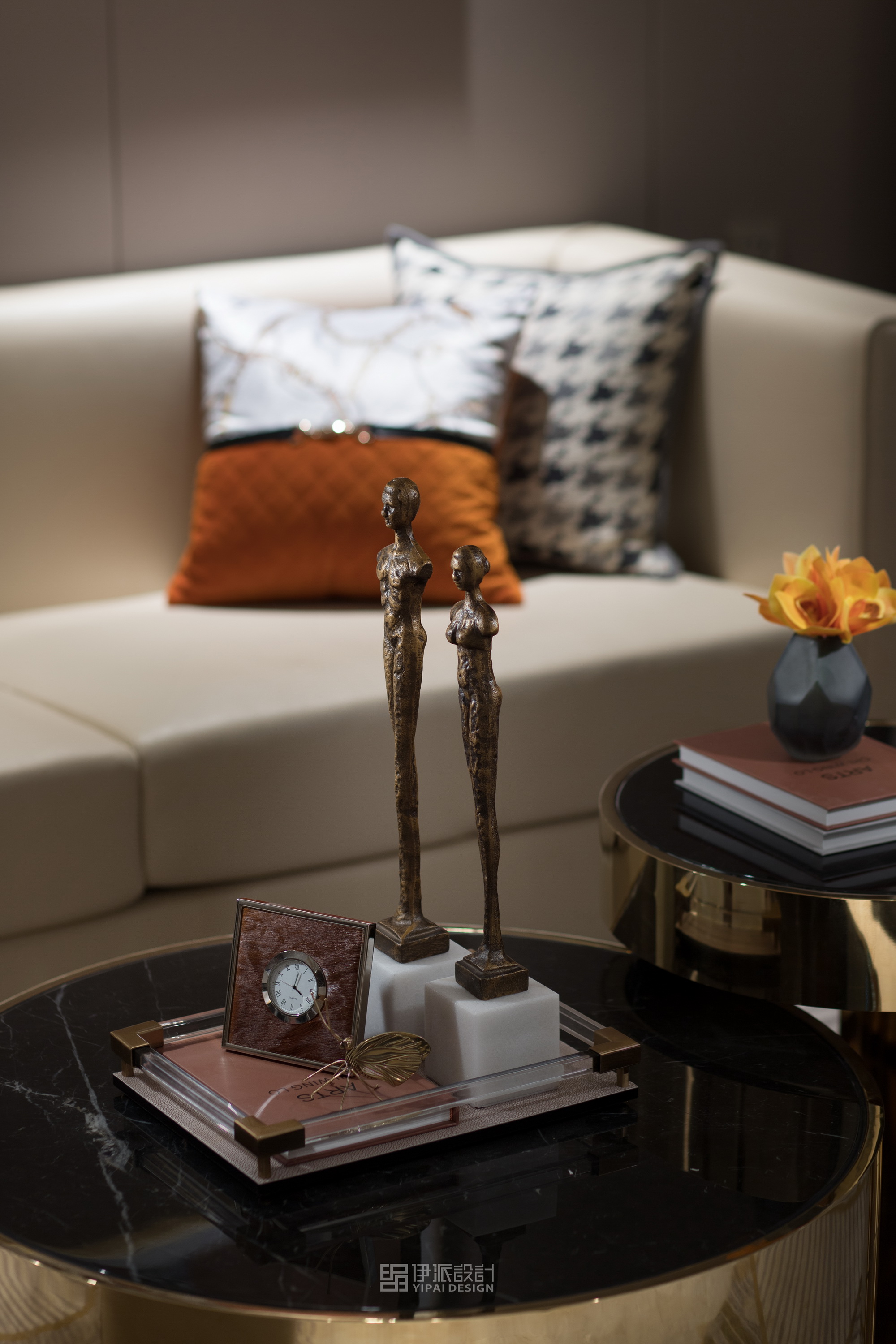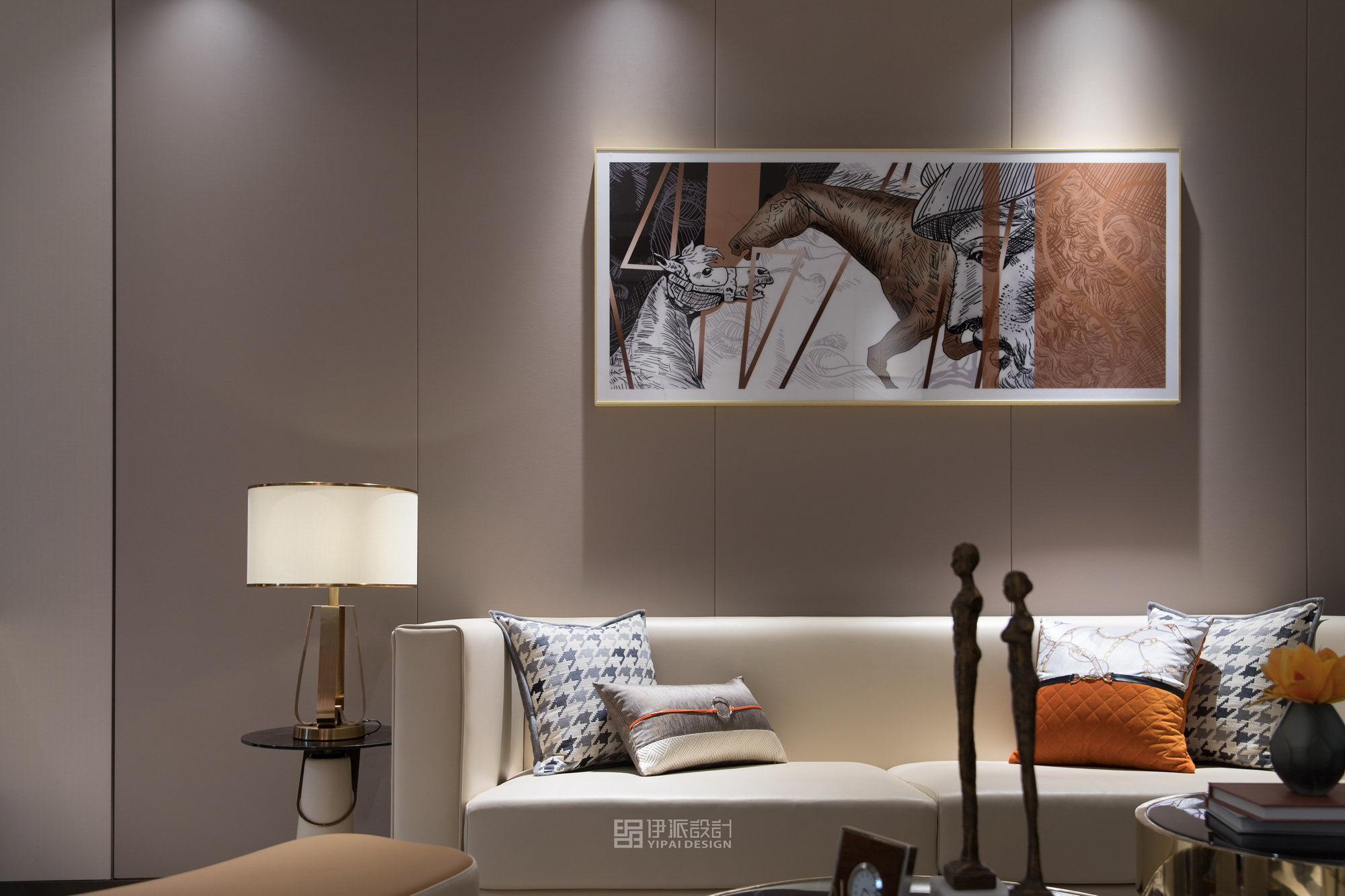 本案軟裝設計工程針對現(xiàn)代空間的美學思考,將上世紀的雕像與現(xiàn)代藝術,融合出獨具一格充滿西方氣息的藝術空間,神秘感縈繞其中,將“愛馬仕橙”作為設計核心,以港式輕奢的格調來定義空間的精神氣質,演繹品質高貴生活。